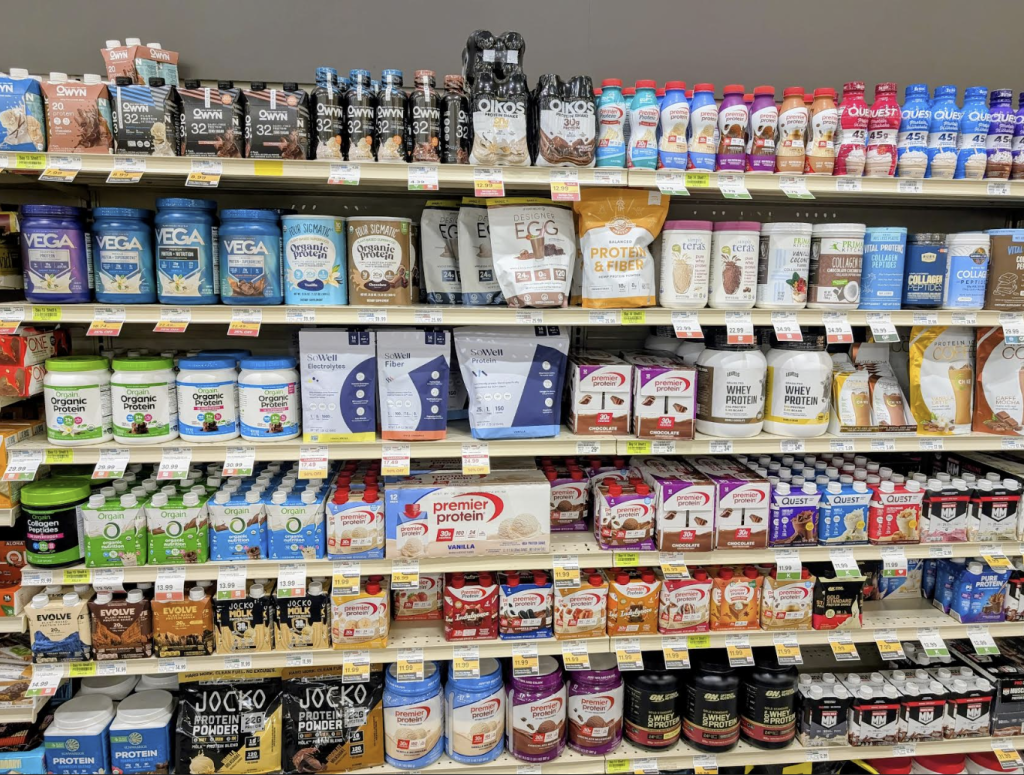 Looking at the shelf-stable protein shake section in another grocery store, Oikos Protein Shakes can be found at shelf, alongside many competitors with larger shelf space (see Oikos Protein Shakes on the top shelf).