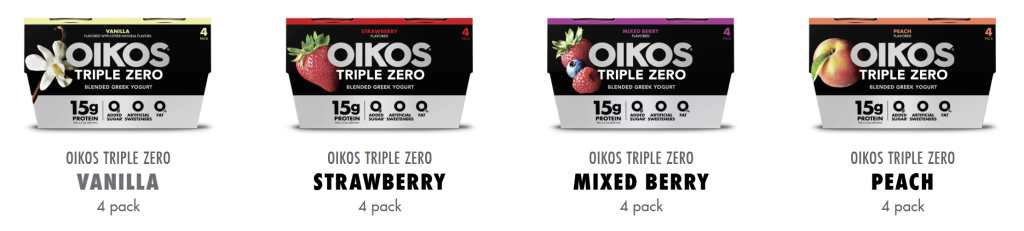 Introduced in 2015, Danone’s Oikos Triple Zero nonfat Greek yogurt product initially targeted men, with its higher protein content, and was termed a “bro-gurt.”   Each cup offers 15 grams of protein, with zero fat, zero artificial sweeteners and zero added sugar.   The primary package color is black, similar to male-targeted protein drinks like Muscle Milk.  Triple Zero does not offer protein drinks. The Oikos Triple Zero sub brand does not offer a protein drink.