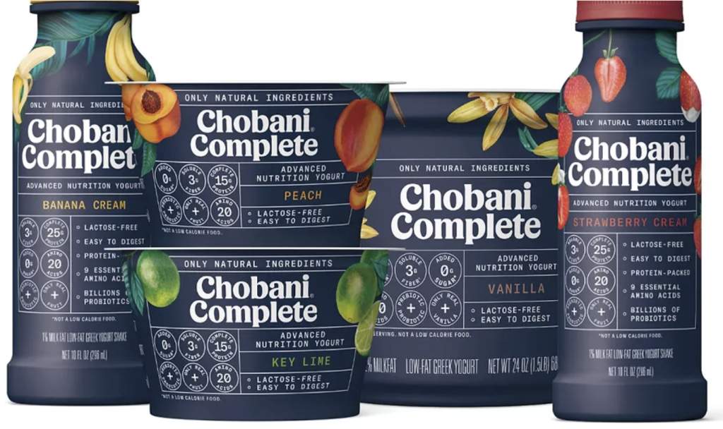 In late 2024, Chobani repositioned from Complete to “protein-forward” branding and also expanded its line of “high protein drinks” to include options for 15 grams, 20 grams and 30 grams and cups with 20 grams of protein.  While not “high protein,” Chobani also continues to offer a 10-gram of protein “Greek yogurt” drinkable yogurt option.